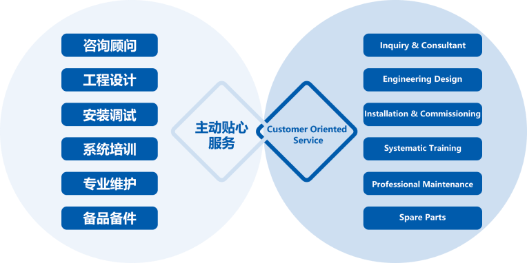 Proactive and considerate services: consulting consultants, engineering design, installation and commissioning, system training, professional maintenance, spare parts