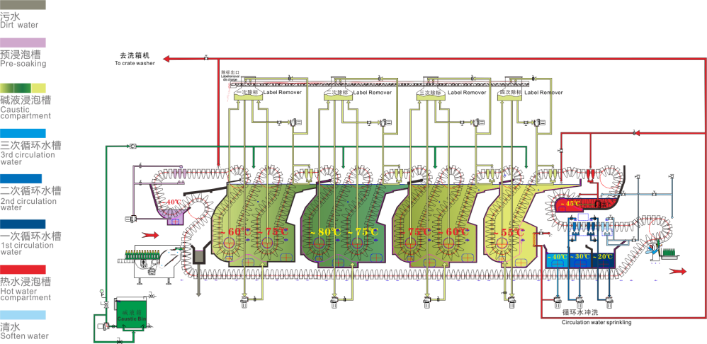 The bottle washer is suitable for washing returnable glass bottles of beer, beverage, alcohol, condiment, etc., with features of water & energy saving.